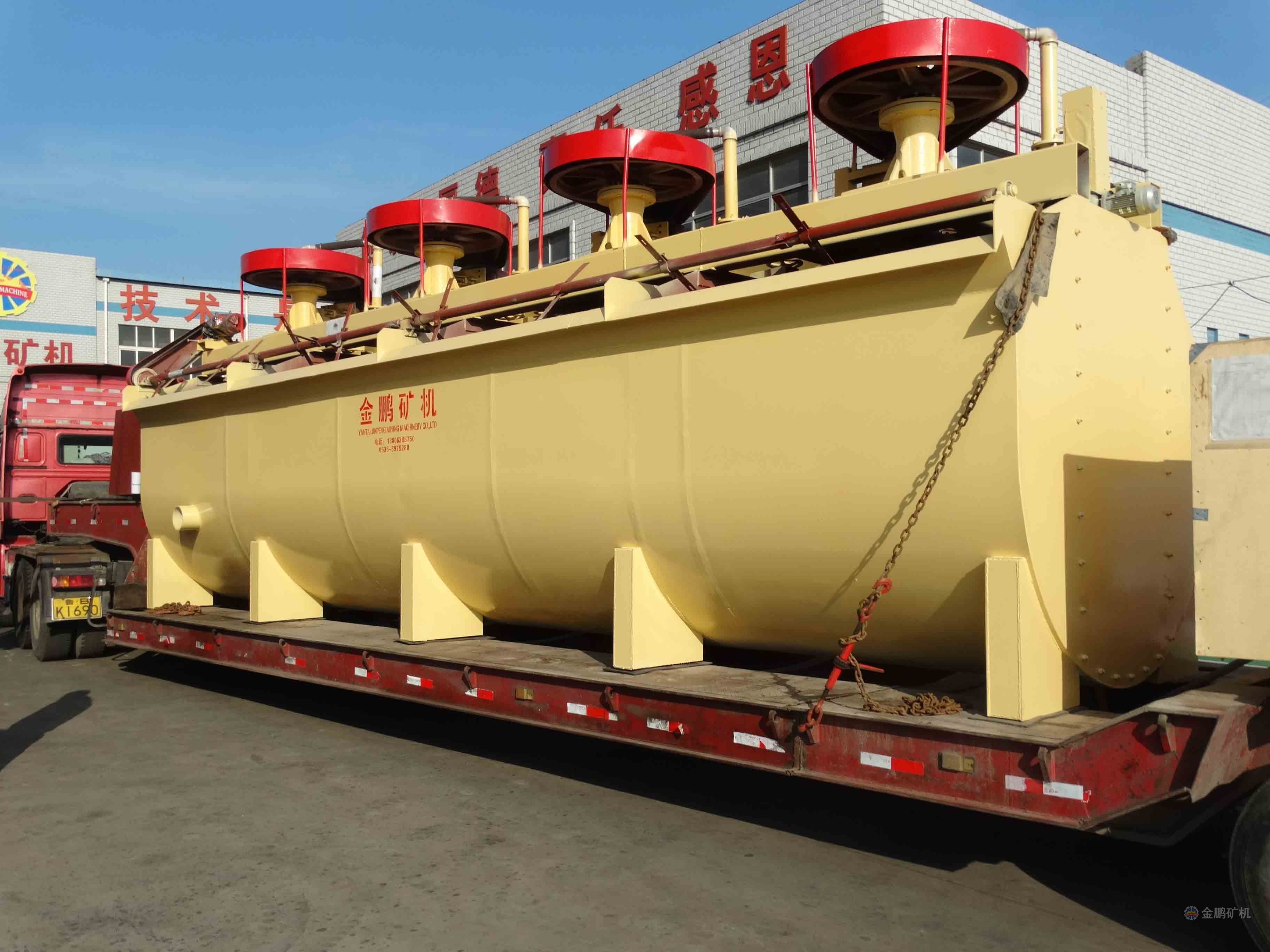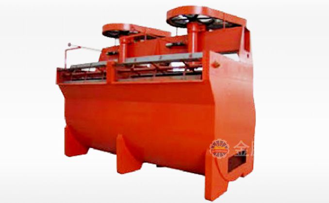 該浮選機工作時,隨著葉輪的旋轉(zhuǎn),槽內(nèi)礦漿從四周經(jīng)槽底由葉輪下端吸到葉輪葉片之間由鼓風(fēng)機給入的低壓空氣經(jīng)空心軸和葉輪腔的空氣分配器,也進入其中。礦漿與空氣在葉片之間充分混合后,從葉輪上半部周邊向斜上方推出,由定子升穩(wěn)流和定向后進入整個槽子中。氣泡上升到泡沫穩(wěn)定區(qū),礦化富集后,自溢流堰溢出。另一部分礦漿向葉輪下部流去,再經(jīng)攪拌,重新混合形成礦化氣泡。剩余的礦漿流向下一槽直至最終成尾礦。